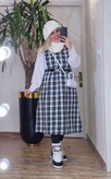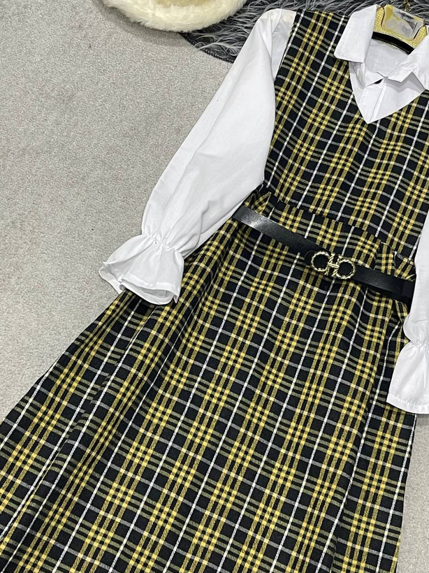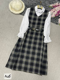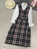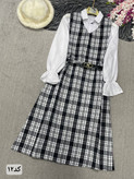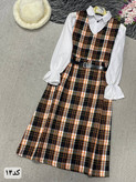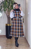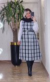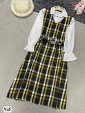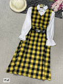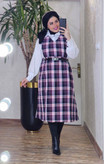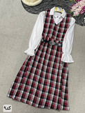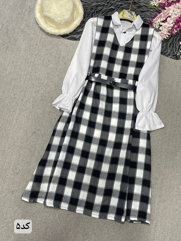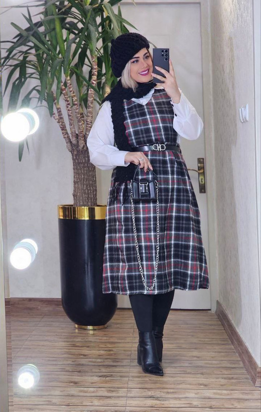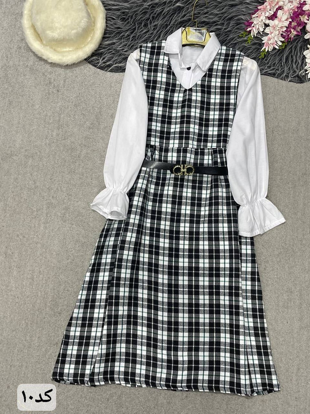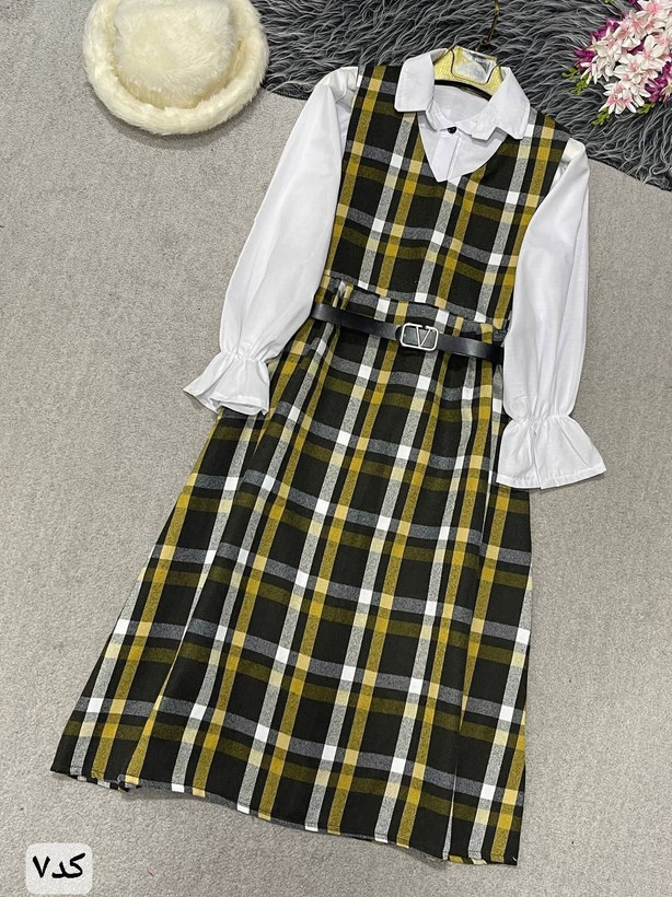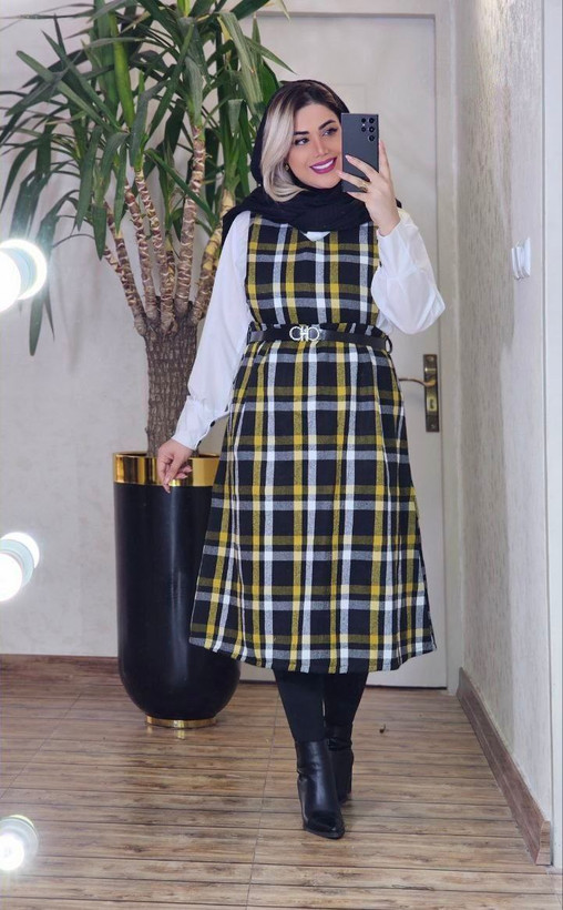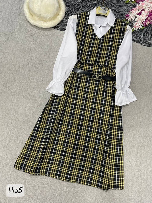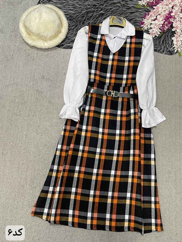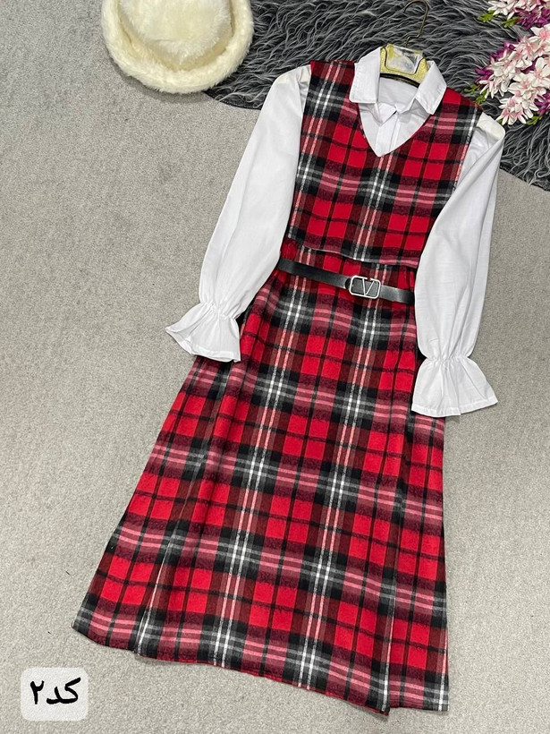 ست سه تیکه شومیز سارافون کمربندپاییزه زنانه جنس شومیزتترون جنس سارافون توئیت پشمی و کمربند چرمی فری اسیر38تا46