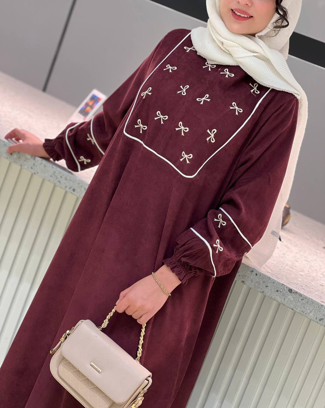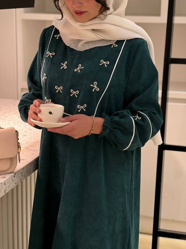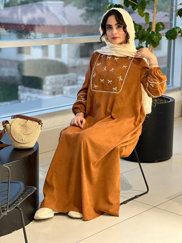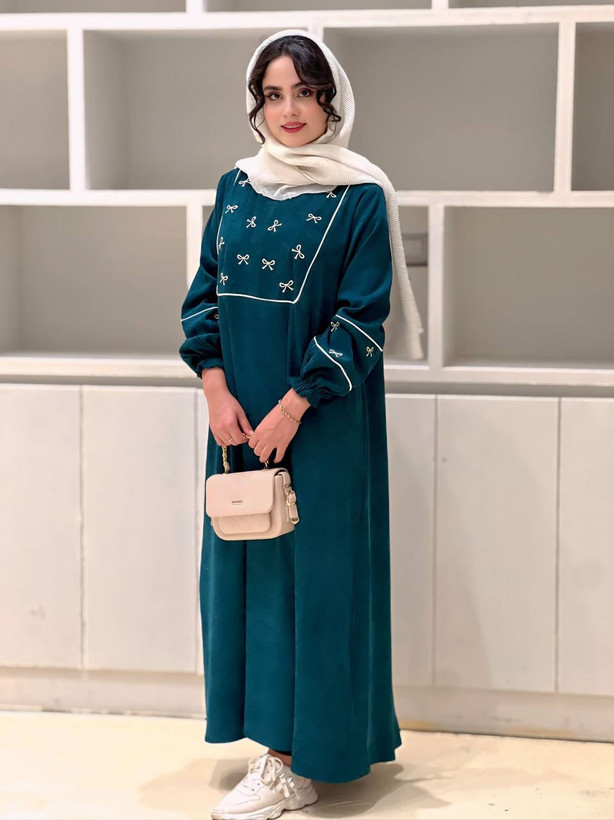 قدکار ۱۴۰ cm قد استین ۶۰cm عرض سینه 116 cm جنس مخمل کبریتی ریز گلدوزی های کار ابریشم مغزی کار کتان جلوی لباس زیپ مخفی دارد و از داخل بند تنظیم☺️