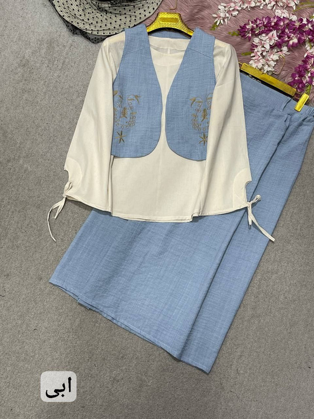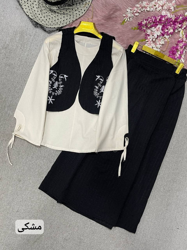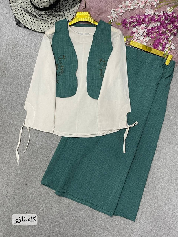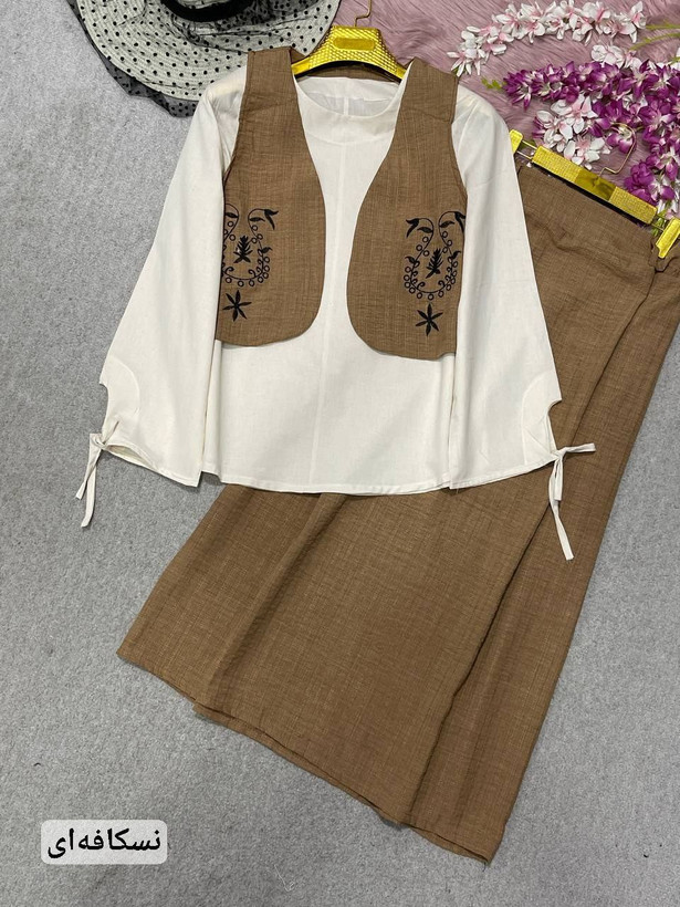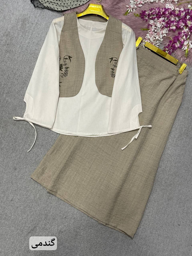 ست سه تیکه شومیز+دامن+جلیقه زنانه مدل نگین جنس شومیز لنین جلیغه و دامن شانتون
