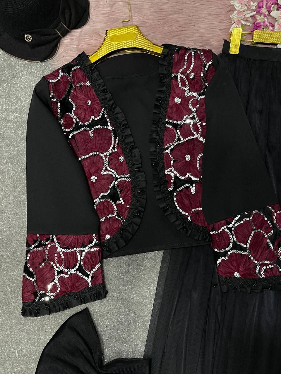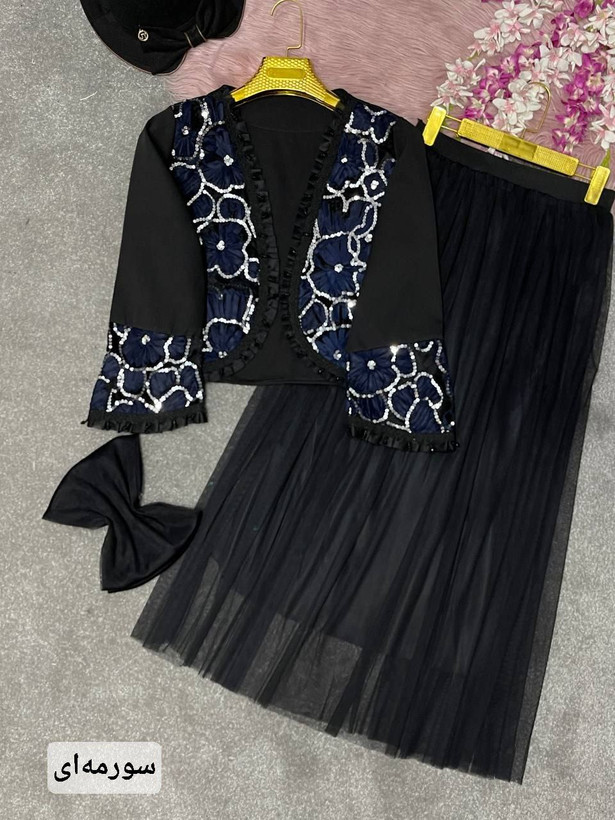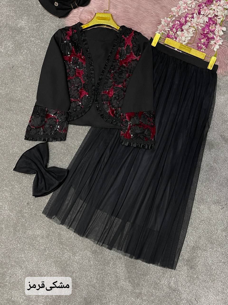 ست سه تیکه زنانه مدل مژده کت +دامن+شال زنانه یلدایی جنس کرپ مازراتی و تور